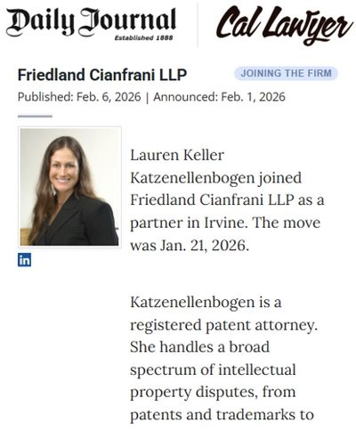 On February 6, 2026, the Daily Journal featured Lauren Katzenellenbogen's move the firm.